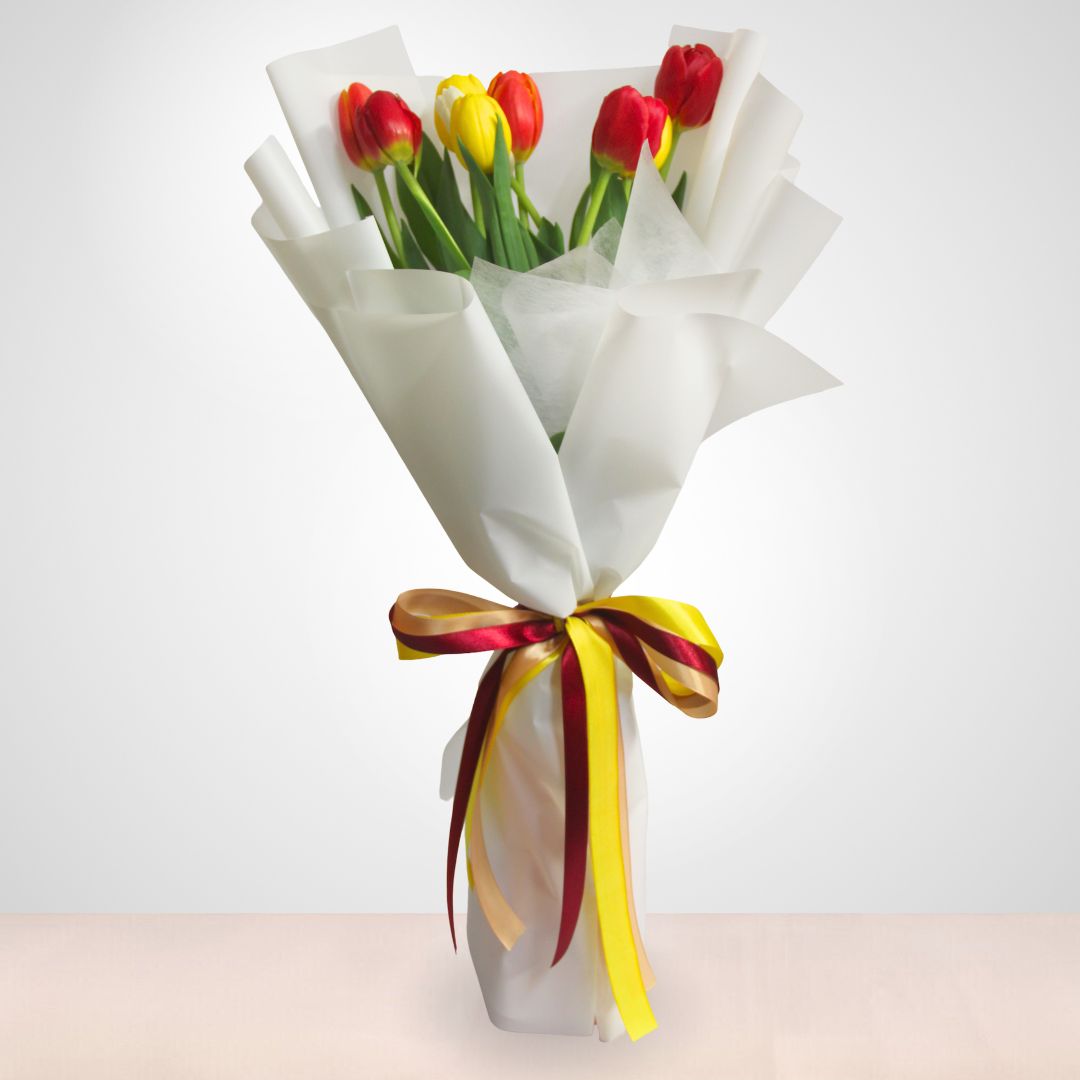 Ramo de 5 tulipanes en tonos naranjas, 5 tulipanes tonos amarillos, listo para regalo.